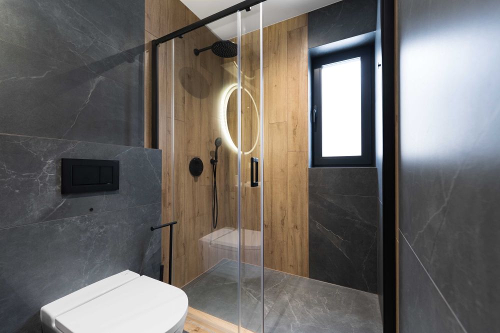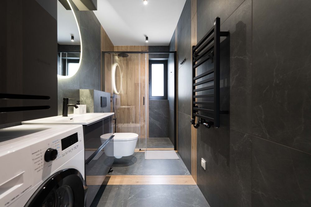 Łazienka z prysznicem, pralką, wc i suszarką do włosów.