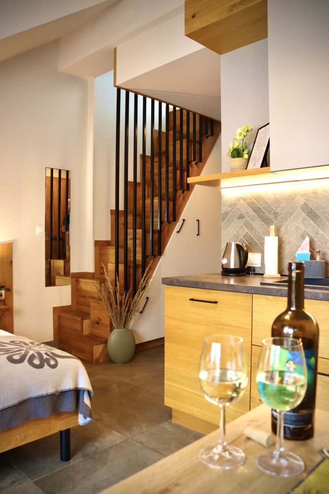 Komfortowy pokój numer 23 z antresolą, aneksem kuchennym i balkonem w Aparthotelu Pod Stokiem, idealny dla 2-4 osób, o powierzchni 26 m², w samym centrum Szczyrku, a jednocześnie z dala od hałasów i zgiełku. Wyjątkowe położenie obiektu gwarantuje bezproblemowy dostęp do dolnej stacji wyciągu na Skrzyczne bez potrzeby wyjeżdżania samochodem. Pokoje wykończone są z użyciem najwyższej klasy materiałów.