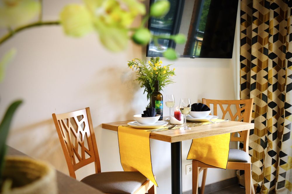 Pokoje z dużym łóżkiem małżeńskim (możliwość rozłączenia), TV z dużym ekranem, stół i krzesła, wyjście na balkon z widokiem na góry lub ogród.