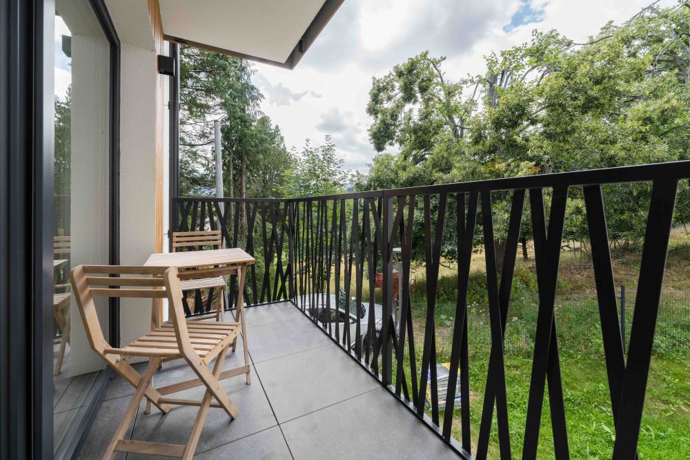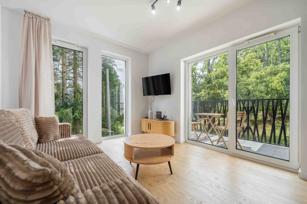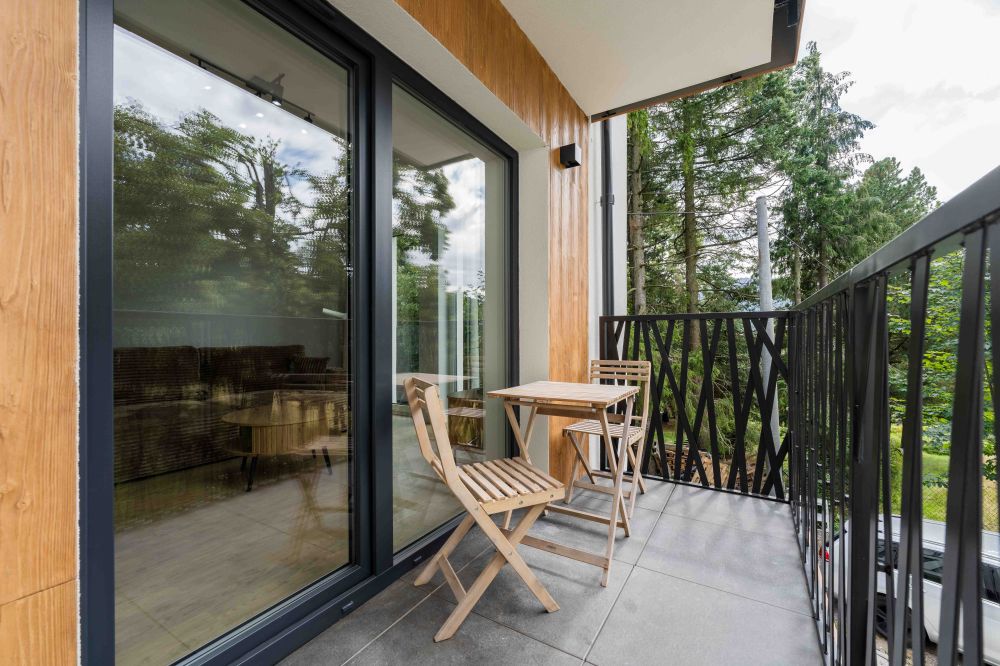 - Balkon – prywatna przestrzeń z widokiem na zieleń, wyposażona w meble ogrodowe – idealna na poranną kawę lub wieczorny relaks.