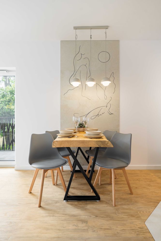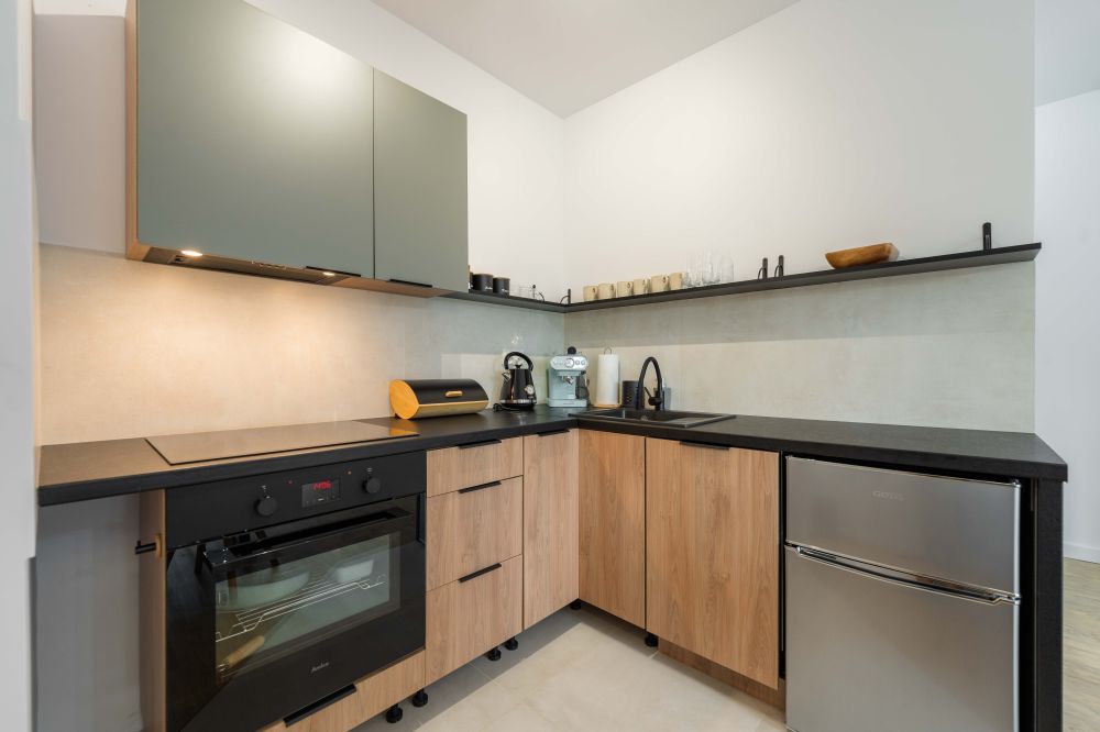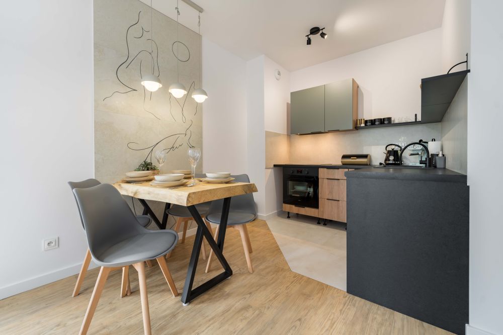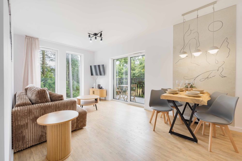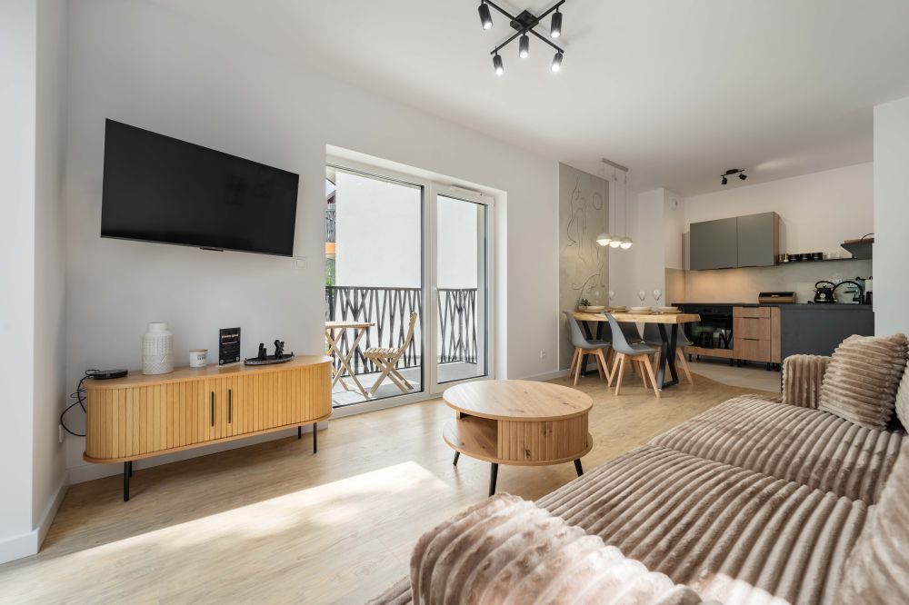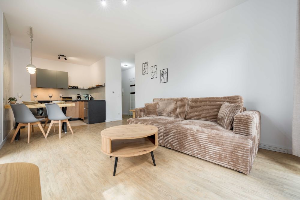 - Salon z aneksem kuchennym – przestronny, jasny pokój z wygodną beżową sofą, drewnianym stolikiem kawowym oraz stołem jadalnianym. W pełni wyposażony aneks kuchenny (lodówka, zmywarka, płyta grzewcza, piekarnik, ekspres do kawy, czajnik) pozwala na wygodne przygotowanie posiłków.