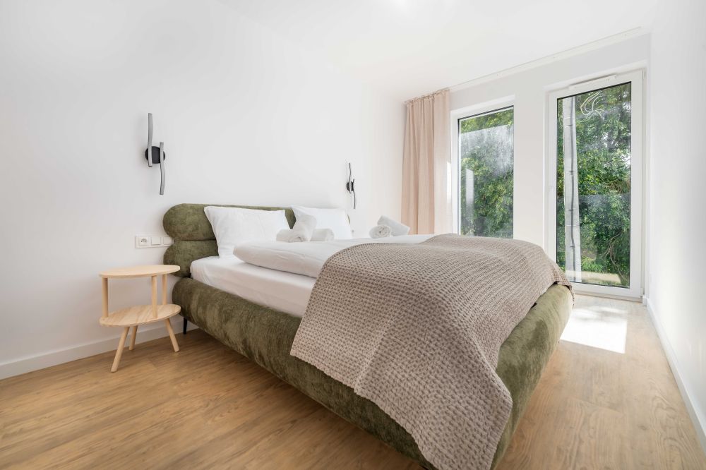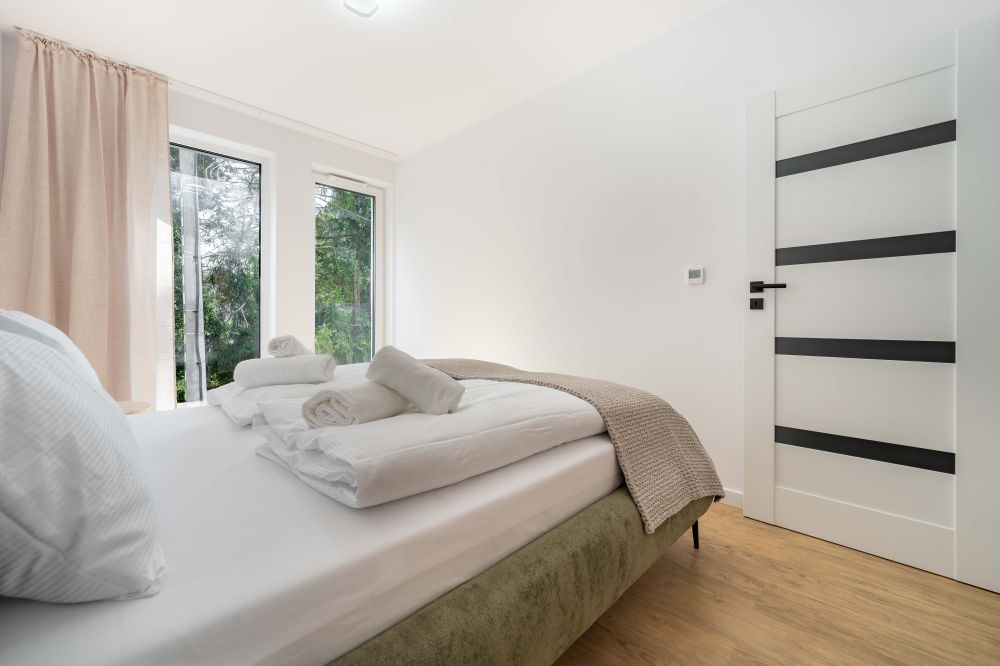 - Sypialnia – przytulna, z wygodnym łóżkiem, szafką nocną i subtelnym oświetleniem.