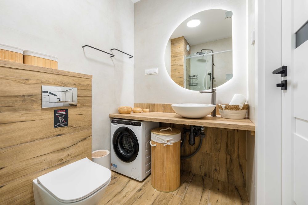 - Łazienka – nowoczesna, z prysznicem typu walk-in, pralką, świeżymi ręcznikami i elegancką armaturą.