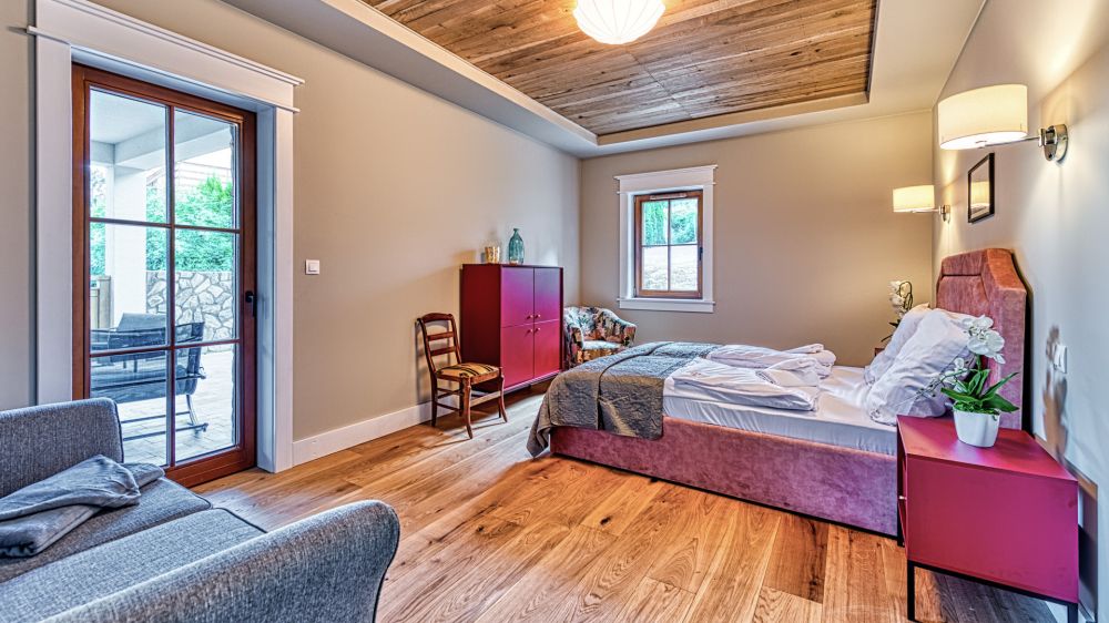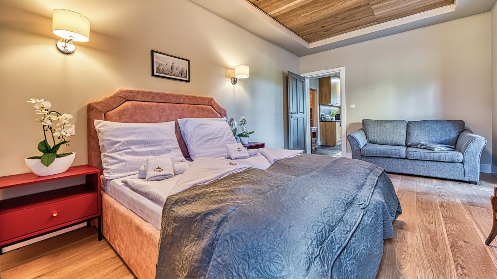 Przytulna sypialnia wyposażona jest w duże łóżko małżeńskie oraz rozkładaną sofę – idealną dla dzieci lub dodatkowych gości.