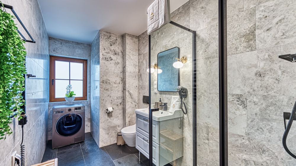 Stylowa łazienka wyposażona jest w prysznic, pralkę, toaletę, zlew i duże lustro – zapewnia pełen komfort codziennego użytkowania.