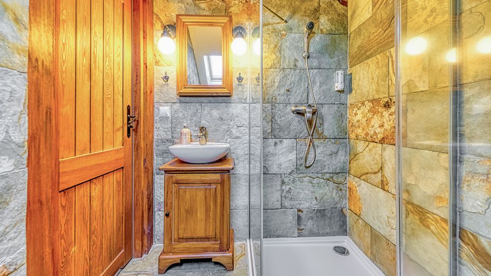 Łazienka została urządzona z dbałością o detale – wyposażona w prysznic, umywalkę i toaletę. Na gości czekają także ręczniki, pościel, ogrzewanie, elegancka dębowa podłoga i szafa/garderoba.