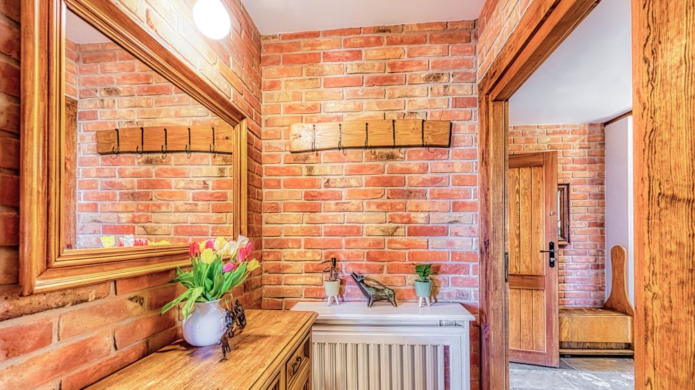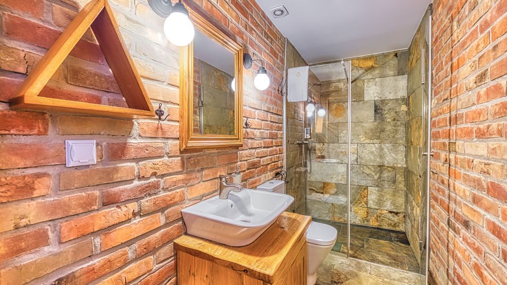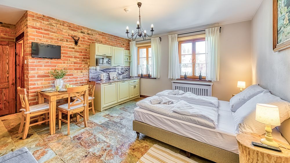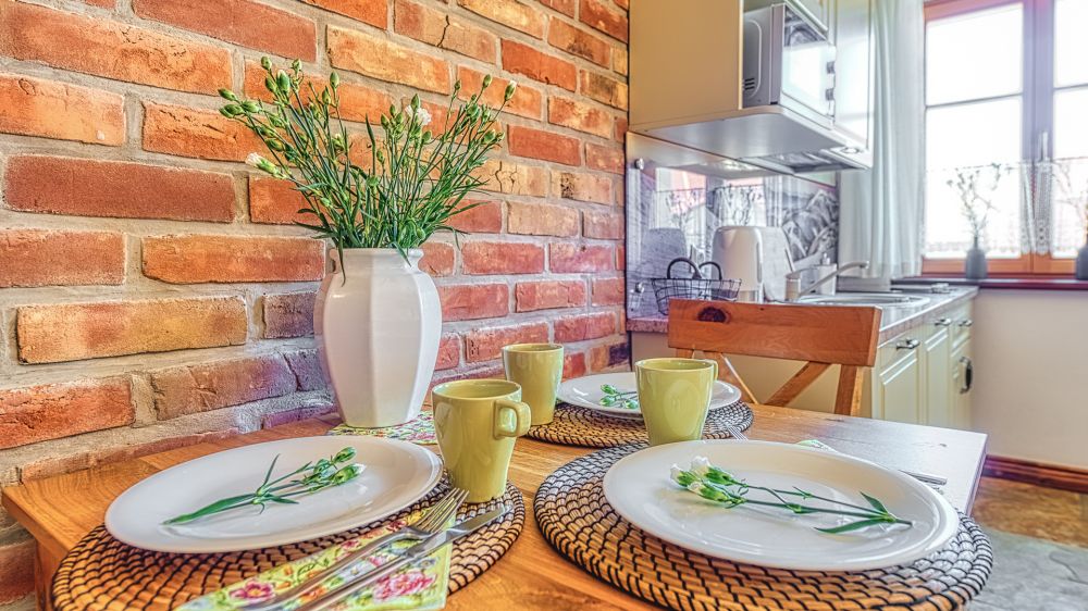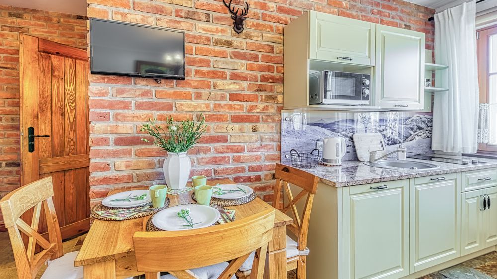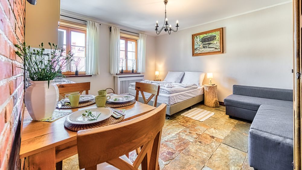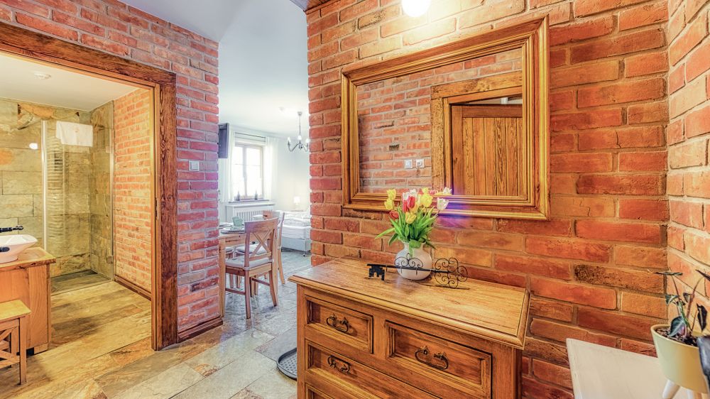 Apartament znajduje się na parterze, a jego wyjątkowy charakter podkreślają ceglane ściany i stylowe detale. To wnętrze, które łączy wygodę hotelu z atmosferą własnego mieszkania.