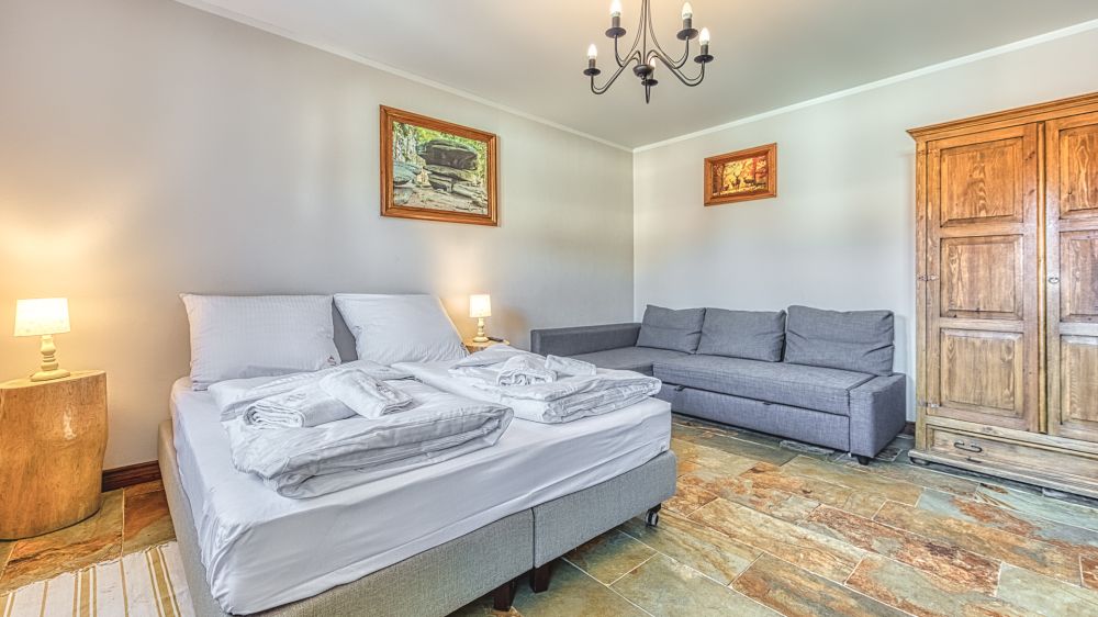 Przestronna część dzienna płynnie łączy się z sypialnią, tworząc otwartą, komfortową przestrzeń. Do dyspozycji Gości są dwa łóżka pojedyncze z możliwością połączenia w wygodne łóżko małżeńskie oraz rozkładana sofa, która zapewnia dodatkowe miejsce noclegowe. Stylowa część jadalna ze stołem i krzesłami sprzyja wspólnym posiłkom i chwilom relaksu.