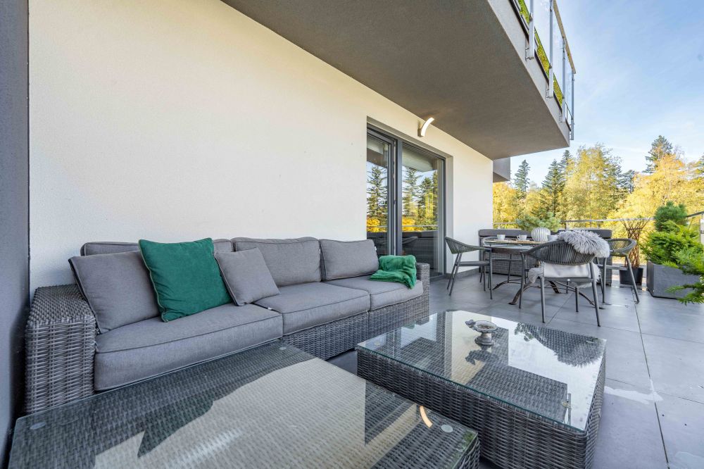 Taras z widokiem na góry - przestronny taras to prawdziwe serce apartamentu – idealny, by wypić poranną kawę z widokiem na Czantorię i dolinę Ustronia.