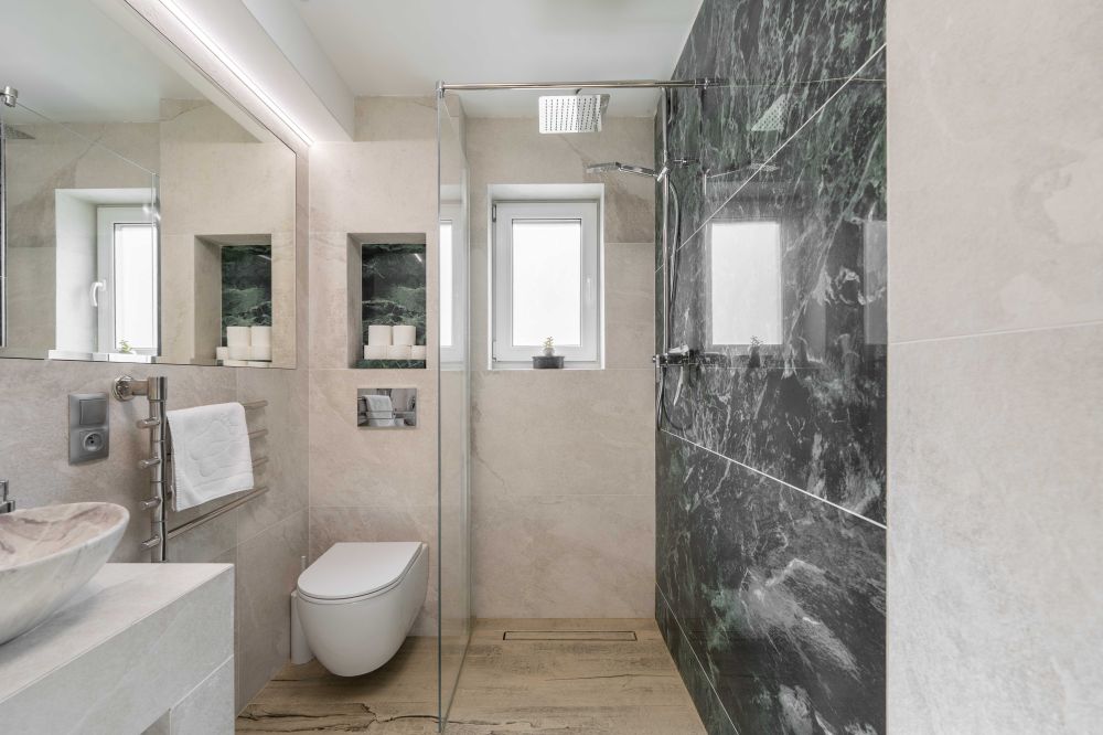 Łazienka - nowoczesna, elegancka przestrzeń w beżach i szarościach.