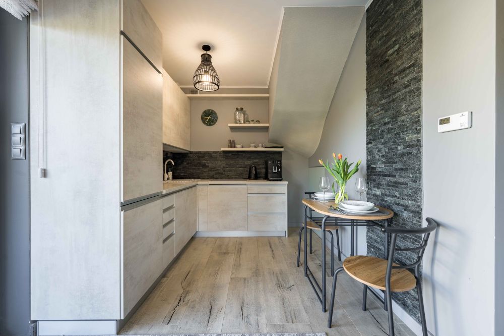 - Aneks kuchenny w pełni wyposażony: lodówka, płyta indukcyjna, piekarnik, mikrofala, ekspres Nescafé, toster, czajnik i kompletna zastawa