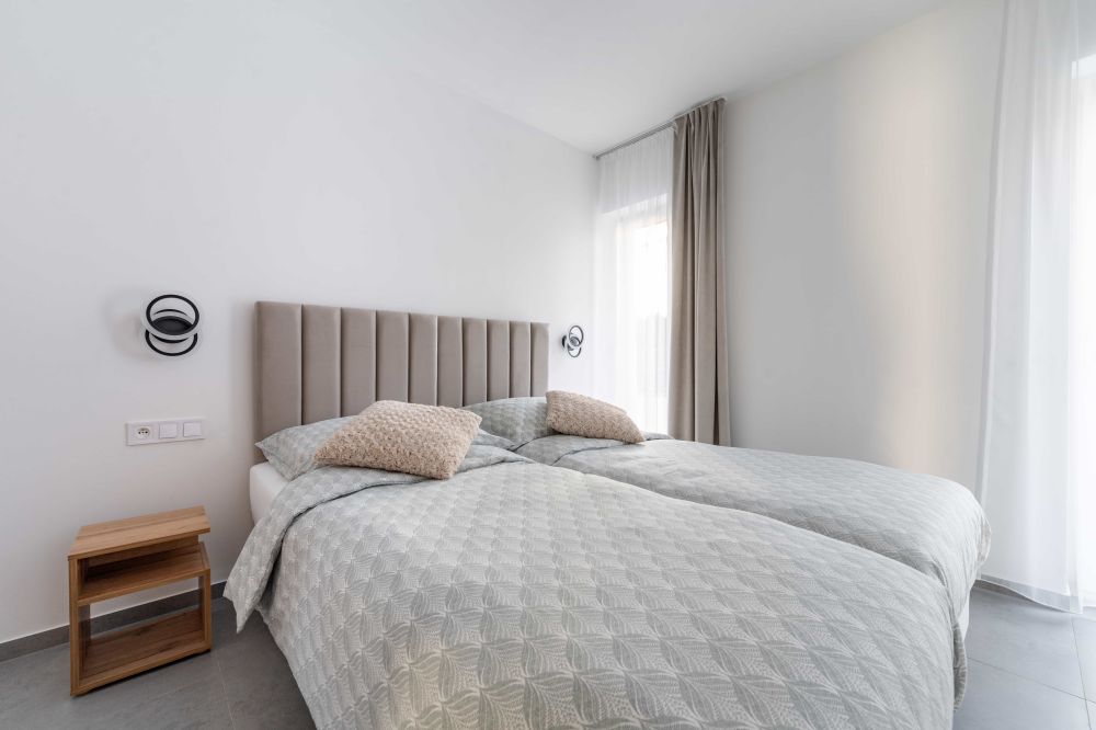 Sypialnia – wyposażona w podwójne łóżko, szafki nocne z lampkami oraz dużą szafę.